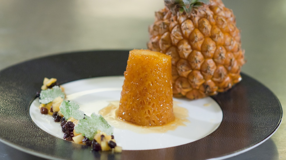 Dans une assiette placez votre cylindre d’ananas chaud et le recouvrir avec l’enveloppe de l’ananas. Dressez une bande de brunoise d’ananas à la coriandre et aux raisins noirs. Décorez avec les feuilles de coriandre cristallisées, dressez la crème malaga dans un petit pot à part.