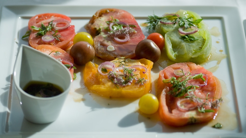 La vinaigrette : Mélangez le jus de citron, l’huile d’olive, la sauce soja, le miel, une pincée de fleur de sel et du poivre. Servir la vinaigrette en saucière individuelle avec chaque assiette de tomate.