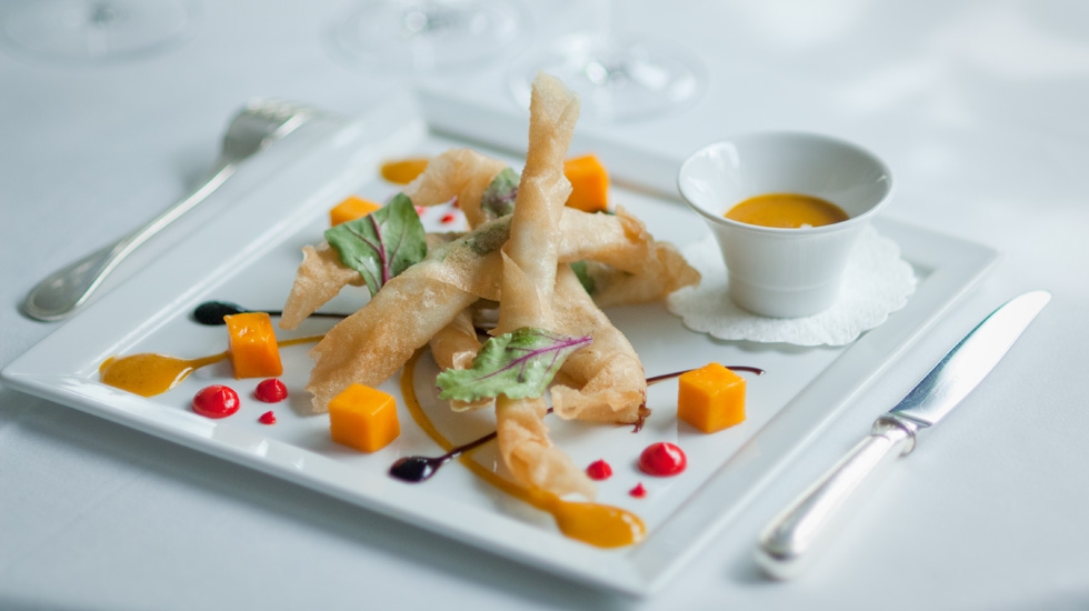 Pour la présentation, vous pouvez décorer les assiettes avec quelques touches de vinaigrette à la mangue, de coulis de poivron et de réduction de vinaigre balsamique puis vous déposez les croustillants, les cubes de mangue, les feuilles de salade et les fleurs comestibles. Servez le reste de la vinaigrette à la mangue en saucière.