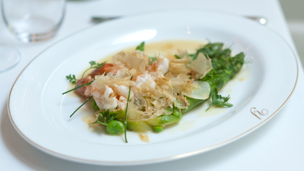 Une fois vos légumes cuits. Rajoutez vos navets, petits pois et fèves. Vous pouvez dresser. Rajoutez vos herbes fraîches : ciboulette, annette, cerfeuil, persil plat. Le jus de cuisson des asperges et des légumes. Et en dernier le Katsuoboushi.