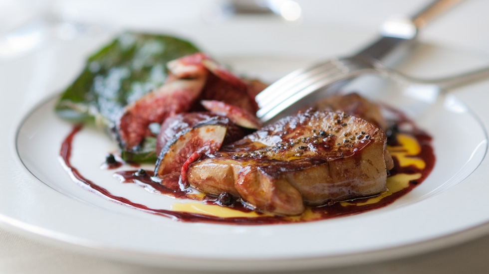 Déglacez avec le porto. Faites réduire de 3/4 en sirop. Ajoutez les jus de l’orange et du citron. Continuez à faire réduire. Salez les escalopes de foie gras. Coupez la troisième figue en fines tranches et versez un filet d’huile d’olive.