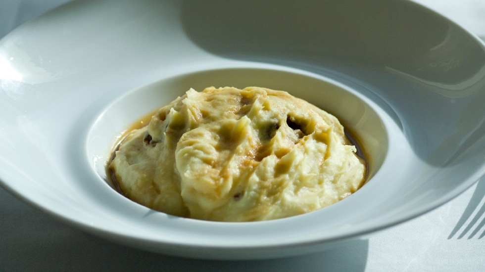 Dans des assiettes individuelles ou dans un plat mettez une couche de viande avec son jus, recouvrez avec une couche de purée. Nappez de jus de truffe et de copeaux de truffe. Si vous n’avez pas de jus de truffe et de truffe, vous pouvez parsemer de chapelure et faire gratiner quelques instants au grill.
