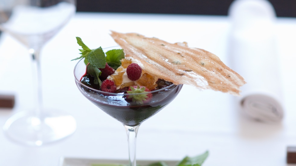 Versez le coulis au fond des coupes, déposez une quenelle de chocolat blanc, quelques feuilles de menthe fraîche puis délicatement quelques fruits rouges, le gingembre confit et une tuile au thym frais.