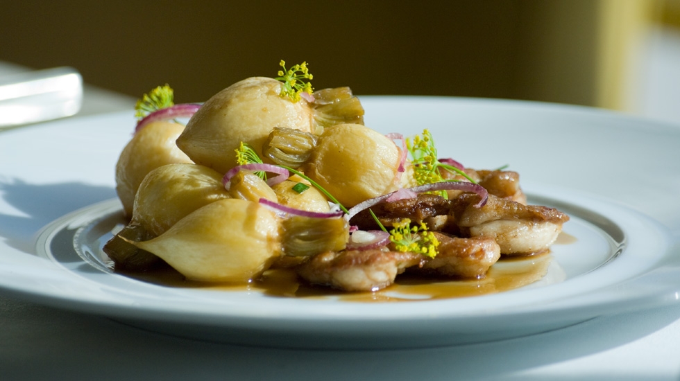 Quand elles sont bien dorées, les disposer dans les assiettes avec les navets, les oignons rouges émincés et parsemer des fleurs d’aneth. Salez et poivrez.