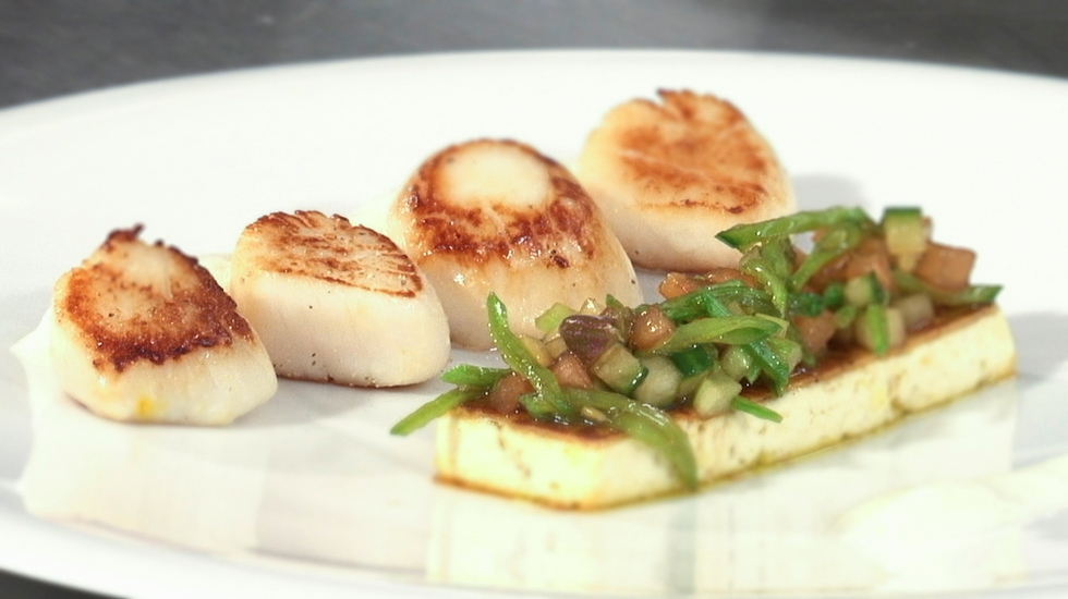 Saisir à la poêle, avec un filet d’huile d’olive, le tofu sur les deux faces. Posez à côté les noix de Saint-Jacques salées. Ne plus les déplacer dans la poêle. Attendez qu’elles colorent et retournez-les rapidement.