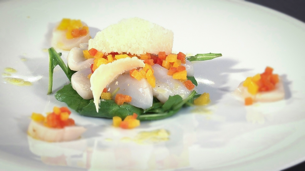 Faites des petits dômes de salade puis posez les noix de Saint-Jacques tranchées. Assaisonnez avec la vinaigrette. Ajoutez les poivrons et quelques copeaux de parmesan.